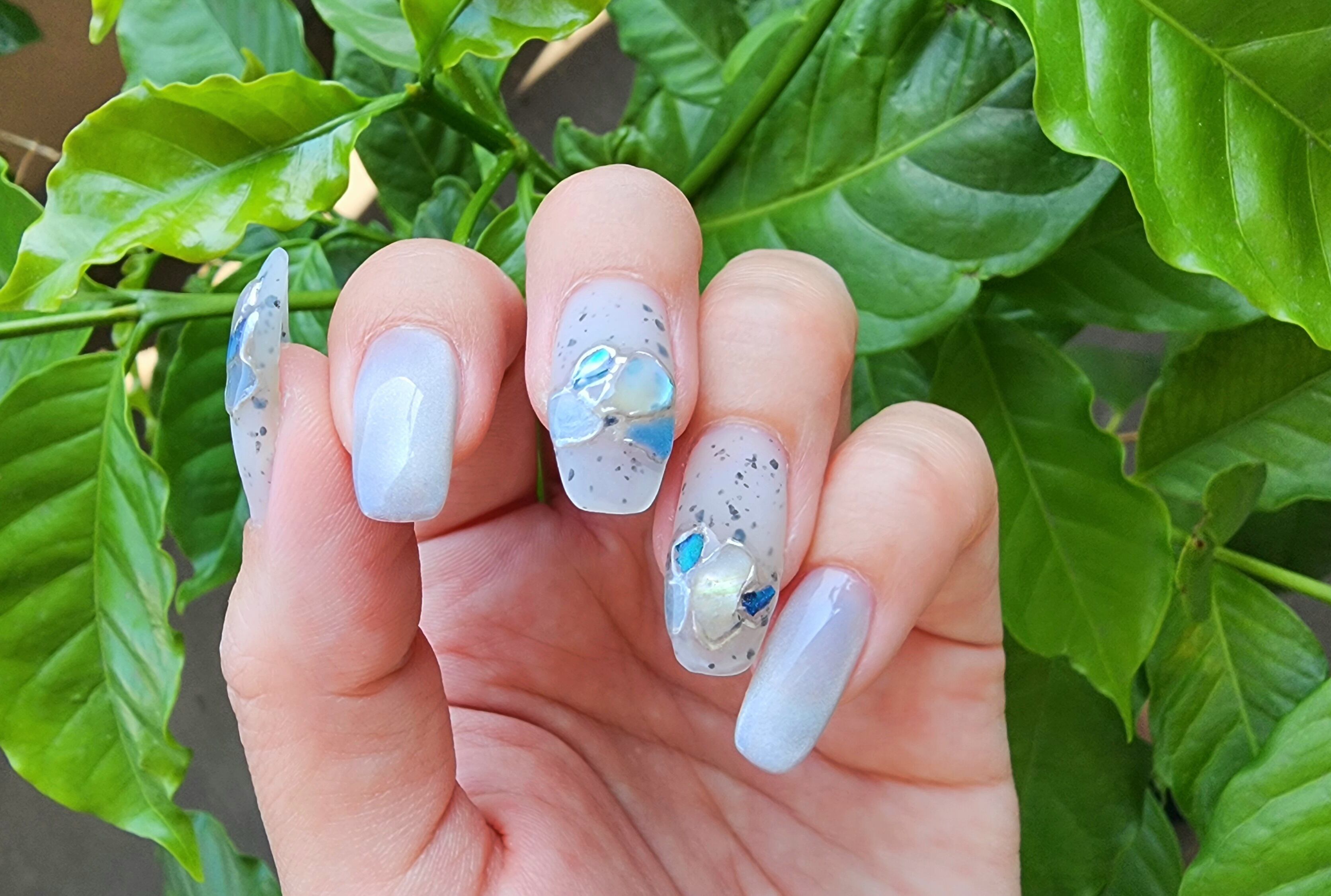 マグネットネイルとシェルを使用したこのネイルチップは、波打ち際を思わせる美しいデザインが特徴です。