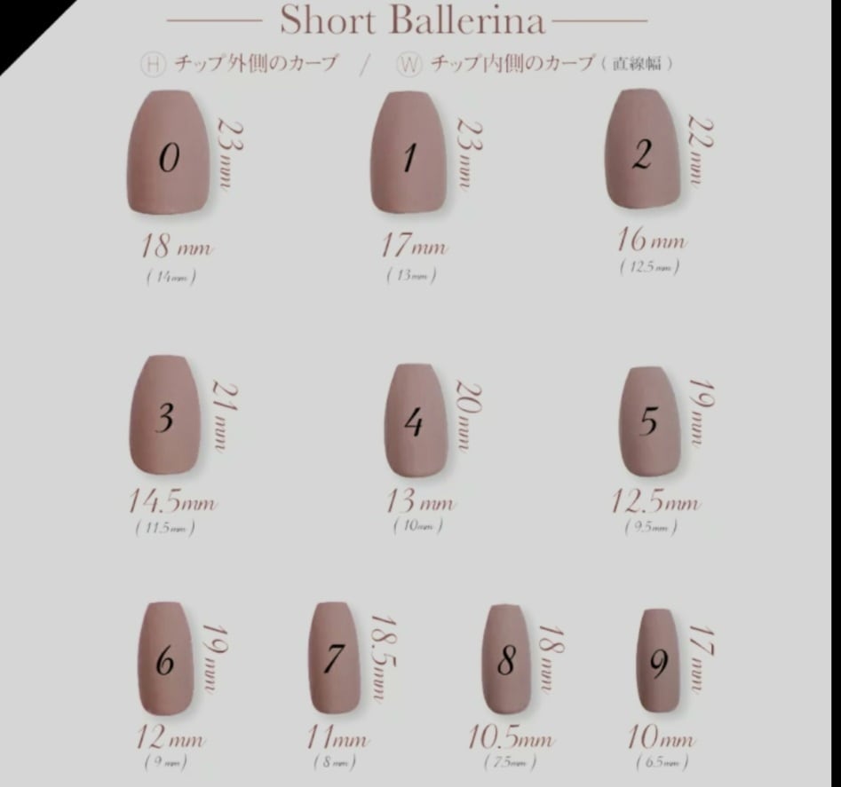 ◯ご注文時にショートスクエア、ショートオーバル、ショートバレリーナ、アーモンド、フットから形を選び、サイズを親指から順に備考欄へご記入ください_