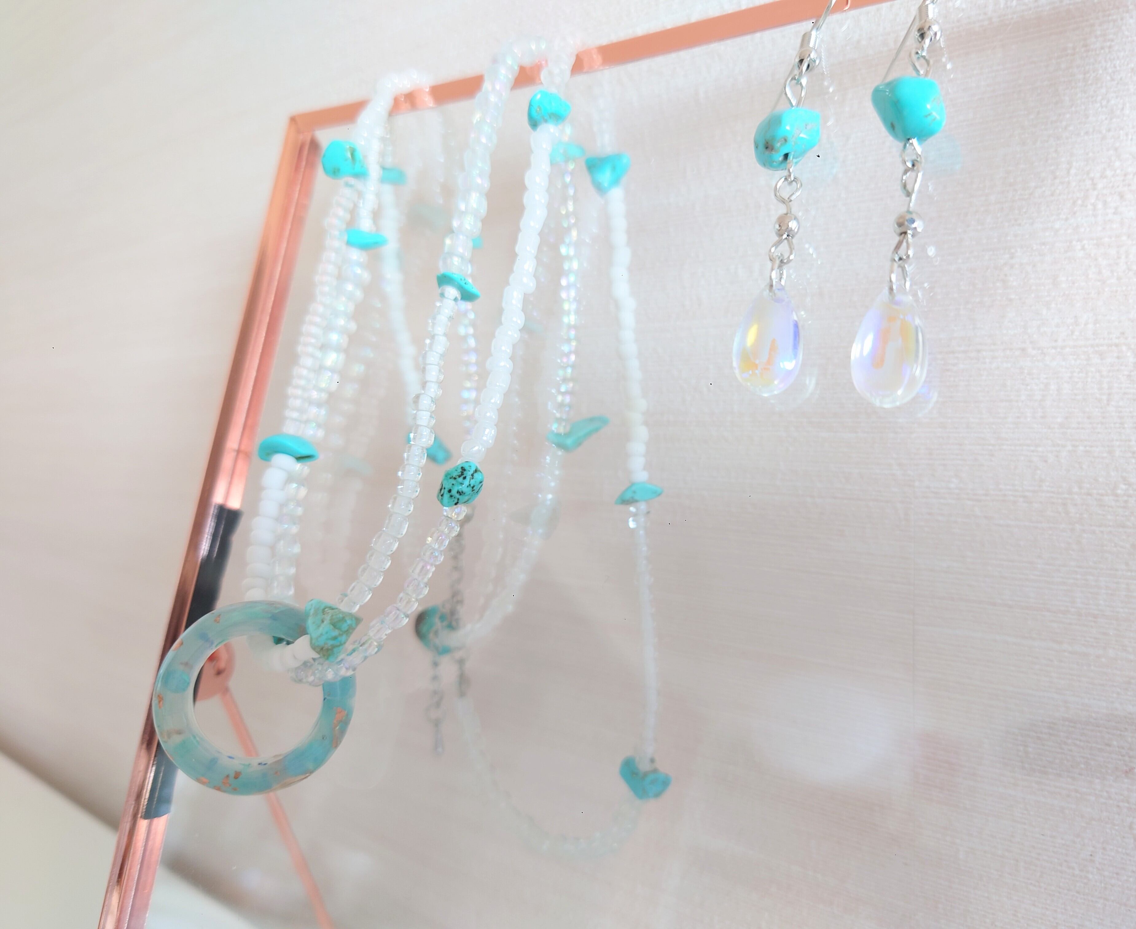 ネックレスは、ターコイズビーズを使った爽やかなデザイン。
