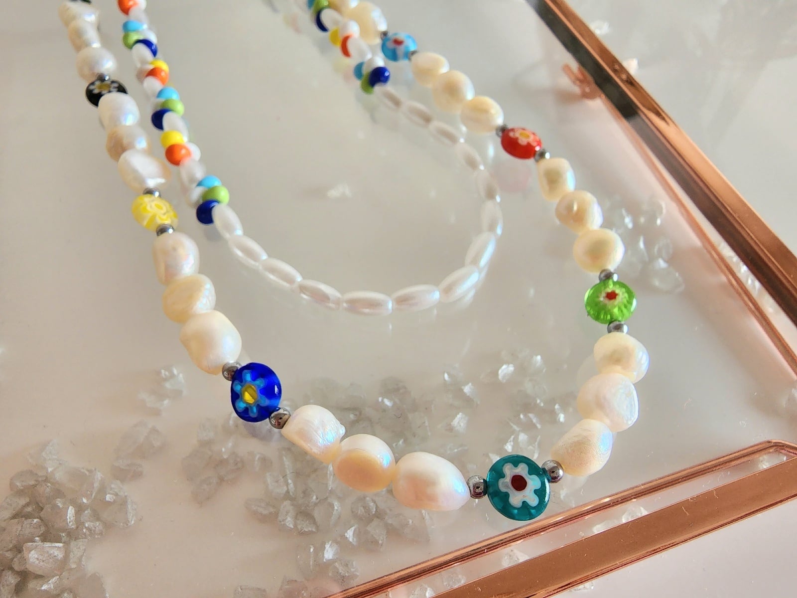 淡水バロックパールとミルフィオリガラスビーズのキュートで遊び心あふれるビーズアクセサリー2点セット。
